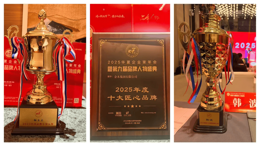 会议期间,大会组委会表彰了在中国经济高质量发展进程中涌现出的领军企业和先进典型。金木集团斩获多项殊荣:董事长钮立卫荣膺“2025中国品牌年度人物”荣誉奖项;高级副总裁韩波获评“2025年度十大创新品牌人物”荣誉称号;金木集团更是斩获 “2025 年度十大匠心品牌”奖项。