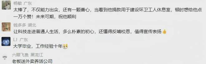 这份感恩之心,最直接地体现在他对母校的回馈上。创业有所收获后,他留意到校园里的环卫工人在冬天只能用开水碗来捂热饭菜,并且缺少一个舒适的休息场所。这个场景深深触动了他。于是,他决定从创业所得中拿出10万元,捐赠给母校用于建设一个智能环卫工人休息室。