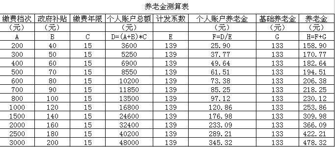 农村养老金的计算并不复杂,主要由基础养老金 个人账户总额÷139两部分组成。基础养老金由政府全额支付,个人账户养老金则取决于个人缴费和政府补贴。以安徽的缴费档次为例,从200元到6000元共15个档次,政府补贴从40元到450元不等,多缴多得的激励机制十分明显。
