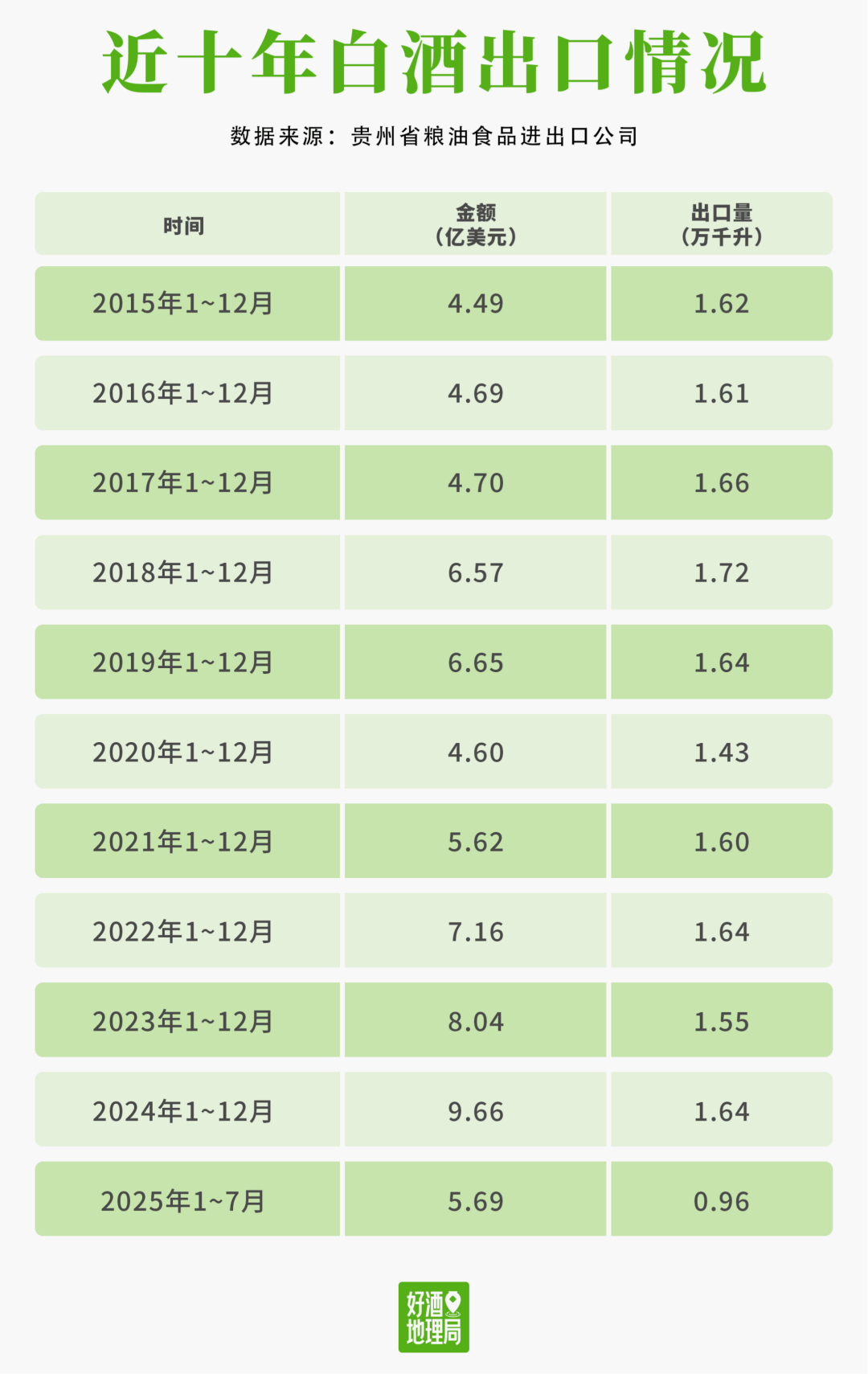 一个颇具意味的现象是:过去十年,中国白酒的年出口量并未大幅增长,始终徘徊在1.6亿升左右。但白酒出口额从2015年的4.49亿美元已翻至2024年的9.66亿美元。